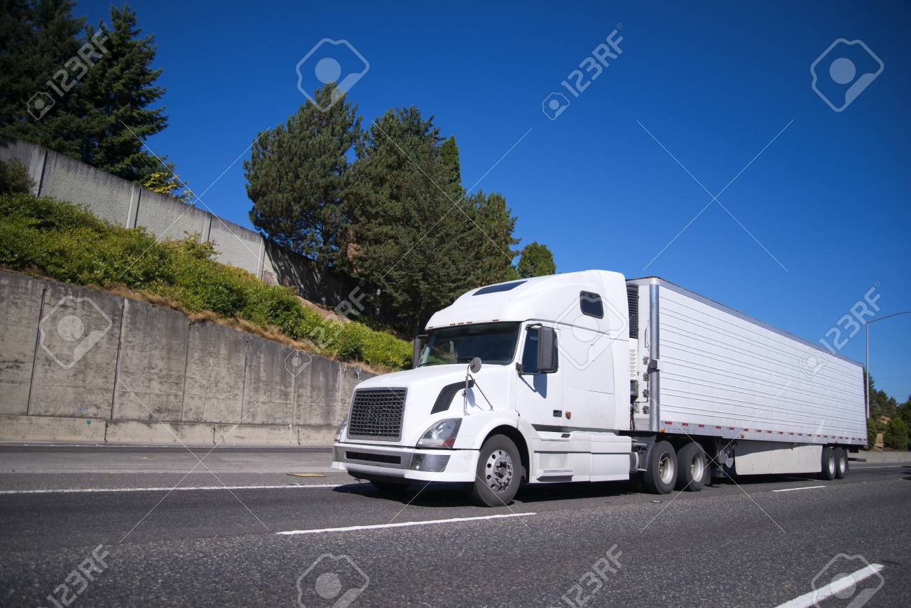 White Modern Big Rig Semi Truck With Reefer Semi Trailer Equipped With Refrigeration Unit Going On Flat Wide Highway With Commercial Cargo For Delivery To Warehouse Stock Photo Picture And Royalty Free